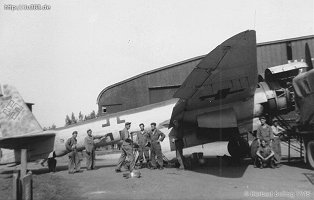Diese Aufnahmen zeigen die Maschine während der Flugerprobung in den USA auf einem bisher nicht näher bekannten Flugplatz. Der Anstrich ist - bis auf die unfachmännisch wieder angebrachten deutschen Hoheistszeichen - weitgehend im Originalzustand, daher kann man annehmen, daß die Aufnahmen in einer frühen Phase der Erprobung gemacht wurden. In diesem Anstrich stand die Maschine auch auf der Kriegsbeuteschau in Dayton/Ohio. Auf dem Foto ganz links ist die Antenne für den amerikanischen Radiokompass beachtenswert.Tip: Klicken Sie auf die Bilder, um sie in höherer Auflösung zu sehen! |