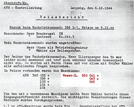Die Ju 388 L-1, Werknummer 560049, die von den US-Streitkräften erbeutet wurde und sich heute im NASM befindet, trägt auf dem Typenschild als Herstellerangabe lediglich den Code "rrx". Durch Zufall kam ich in den NASM-Archiven in Besitz von Dokumenten, die belegen, daß die 560er Serie von Weserflug in Liegnitz in Schlesien gefertigt wurde. Da wäre zunächst der Reisebericht der Herren Brachvogel und Lantzsch von ATG vom 6.12.1944: