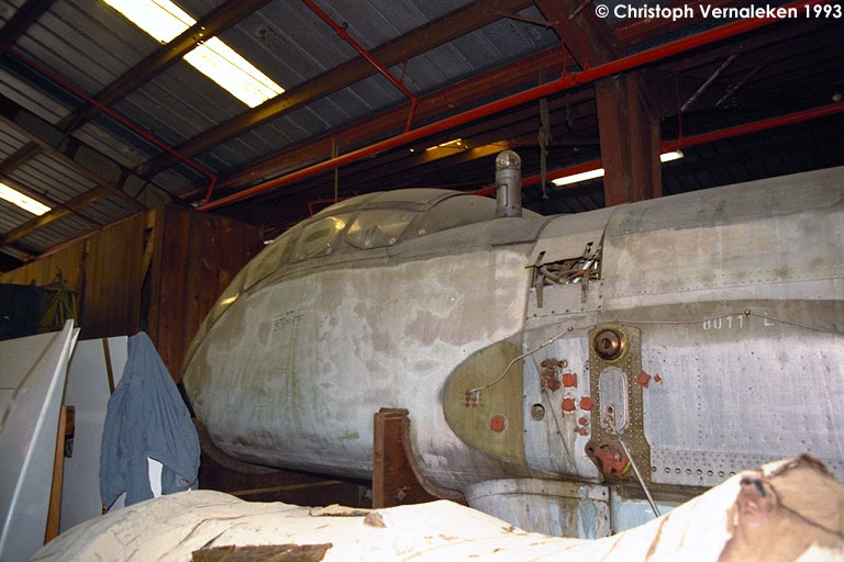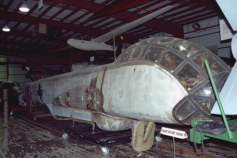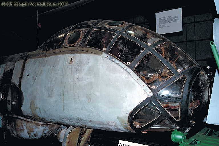 Eine meiner schönsten Außenaufnahme ist folgende Fotografie der Cockpitsektion, die etwas kleiner schon auf der Hauptseite zu sehen ist. An der Stelle, an der das Cockpit in den Rumpf übergeht, sieht man das Periskop, das zum Ausrichten der Waffen des Heckstandes benutzt wurde. Rechts unterhalb ist eine halboffene Wartungsklappe. Man erkennt darunter deutlich die Umrisse der Tragfläche, wohl weil die Maschine in den USA mindestens einmal überspritzt wurde. Der Anstrich ist verwittert, da die Maschine in Silver Hill zunächst im Freien gelagert war. Innerhalb der Umrisse der Tragflächen sieht man zwei der vier Kugelverschraubungen für die Tragflächen sowie die Anschlüsse für Steuerung, Kraftstoff, Schmieröl etc.