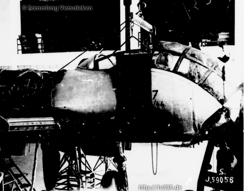 Rechts: Die Kanzel einer Nullserienmaschine, höchstwahrscheinlich aus der Baureihe K-0, wird hier im September 1944 in Merseburg an den Rumpf angebaut. Ein Fahrwerksbein steht ebenfalls zum Einbau bereit. Der scheinbare Schaden an der Kanzel ist ein Fehler im Negativ. Die sichtbare große "7" ist Teil einer längeren Nummer, die durch den Haltegurt verdeckt wird. Denkbar wäre, daß es sich um die 27. Maschine K-0 handelt; das wäre dann die Ju 388 K-0 V11 mit der Werknummer 230 727, die als Erprobungsträger für den Jumo 222 A/B vorgesehen war. |